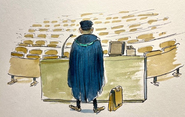 “Maar … Nee, ik zit midden in een lezing. Een lezing in Leuven. In Leuven.”
